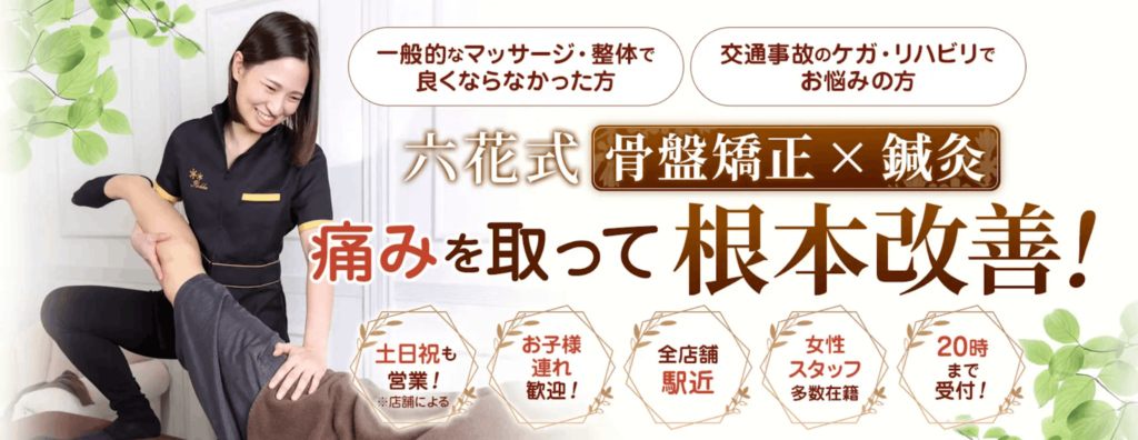 六花鍼灸整骨院&整体院は、整体・鍼灸・骨盤矯正などを組み合わせた施術を行っています。肩こりや腰痛などの慢性的な不調から、交通事故によるむち打ちなど幅広い症状に対応しているのが特徴です。
