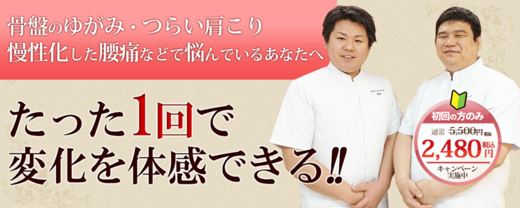 当院に在籍する整体師は、3万人以上の施術実績を持つ理学療法士監修の技術研修を受けているため、どなたでも安心して施術が受けられます。今なら初回限定キャンペーンを行っているので、お得に整体に通うチャンスです。