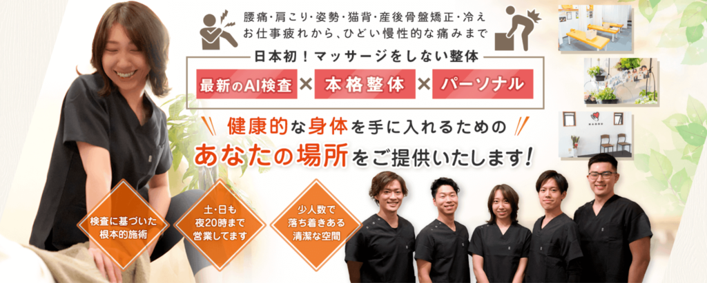 NAORU整体は「マッサージをしない整体院」として有名です。AIによる姿勢分析などを活用し、体の歪みや筋肉バランスをデータで確認しながら施術を行います。